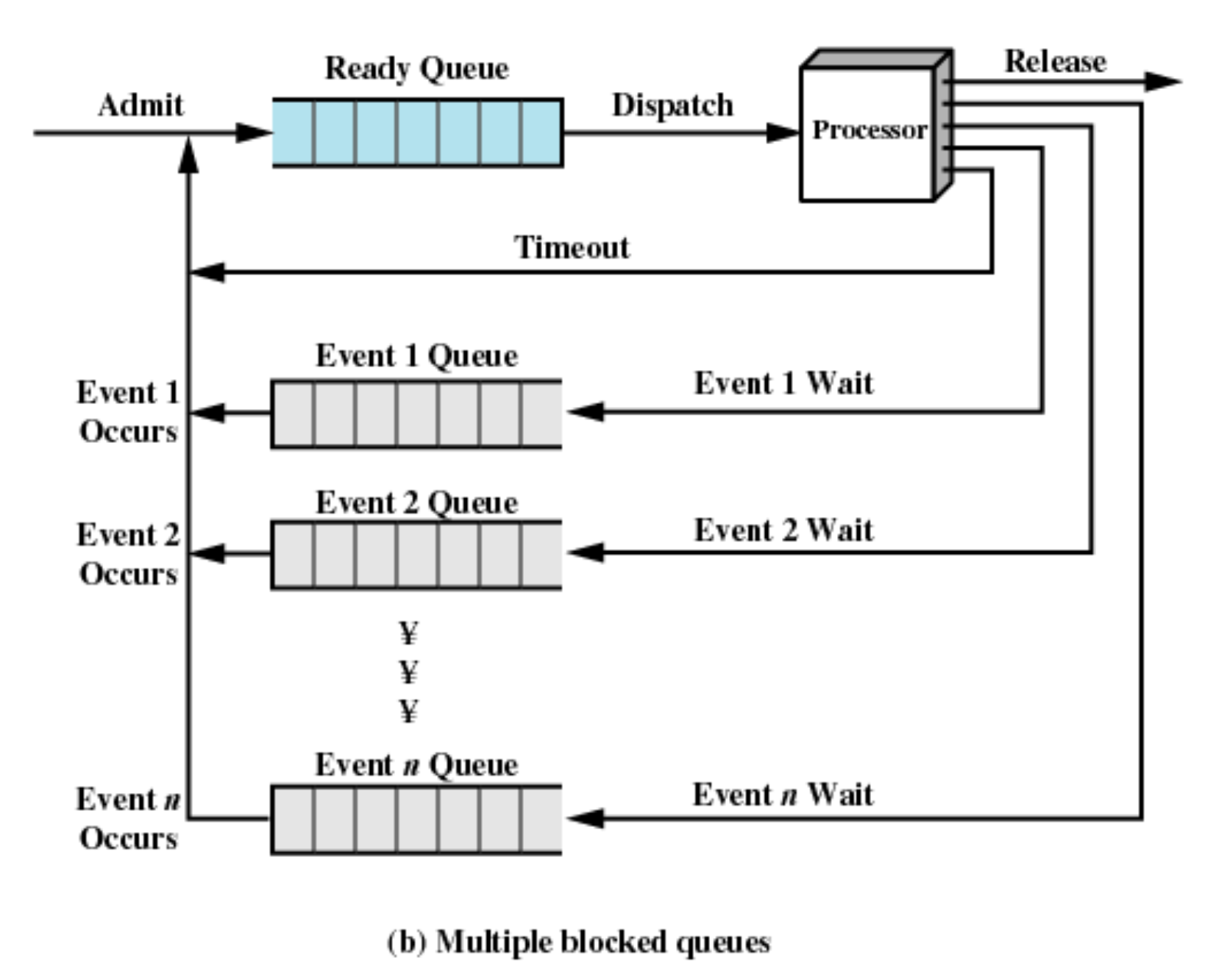 blocked 상태에서도 큐를 가지고 프로세스를 관리하게 됩니다. single blocked queue는 큐를 하나만 가지고 프로세스를 관리합니다. 만약 이렇게 된다면 각 기다리는 이벤트의 응답 시간이 다양한테, 효율적으로 처리할 수 없다는 단점이 있습니다.