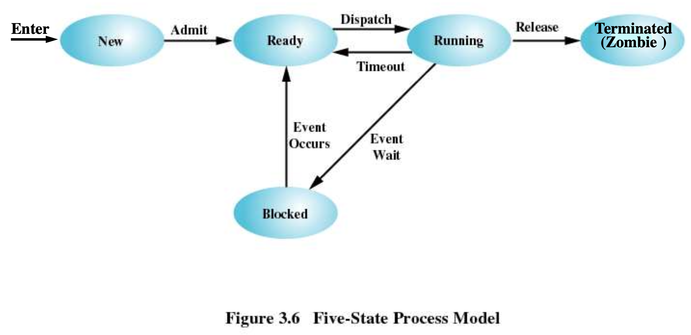 Not Running 부분에서 설명했던 상태입니다. 사용자의 입력을 기다리거나 하는 등의 특정 이벤트를 기다린다면, CPU가 이 이벤트가 발생하기까지 기다리는 것을 비효율적입니다. 따라서, Blocked 상태로 전환하여, 이벤트를 기다리게 됩니다.