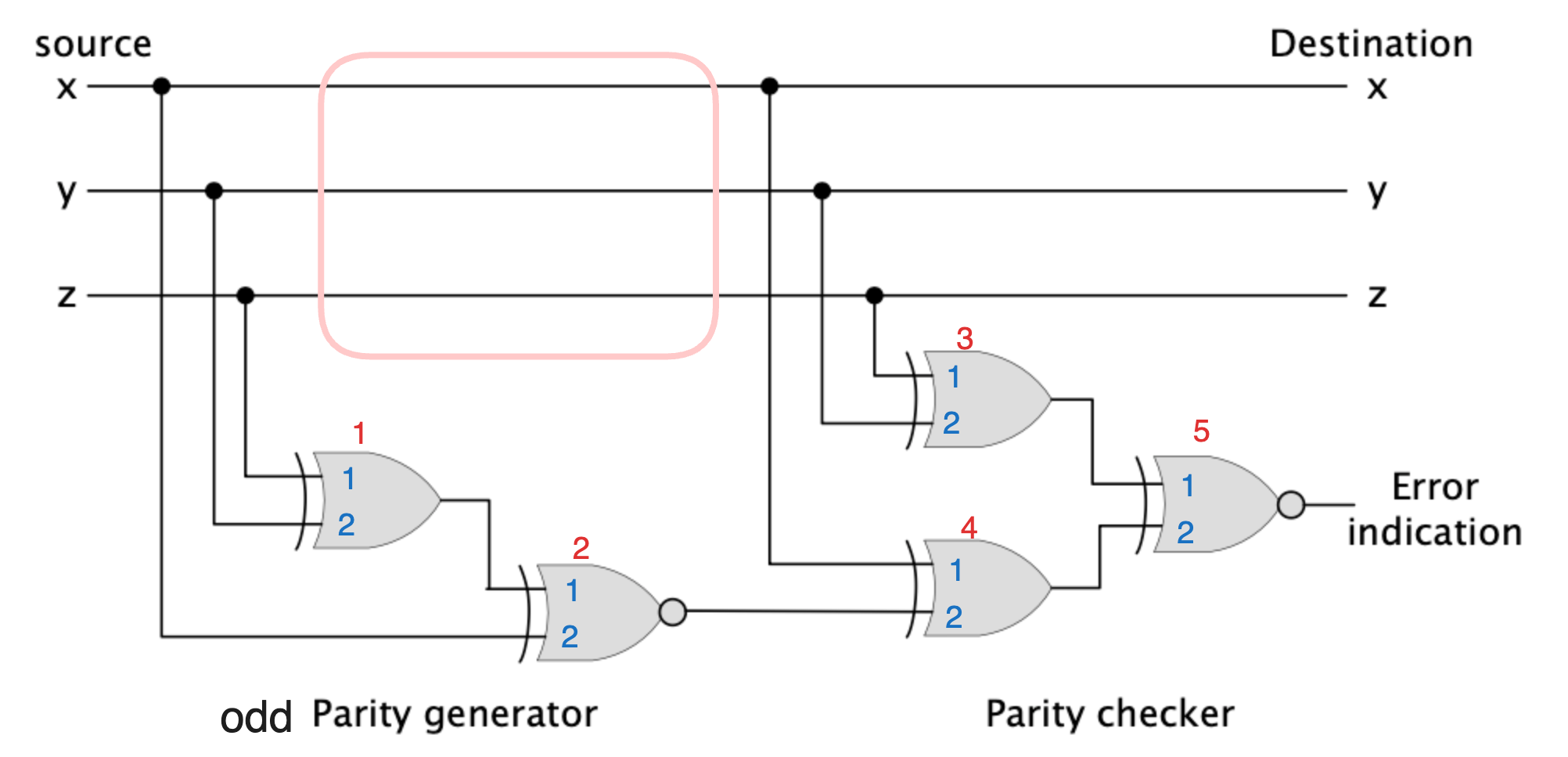 딱 여기서 2번 게이트의 값이 바로 Parity bit인 것이다. 우리는 odd parity bit를 가정하였고, 입력은 x=1, y=0, z=1이었으니, odd parity bit의 값은 1의 개수가 홀수가 되게 하기 위해서 1을 나타내게 된 것이다.