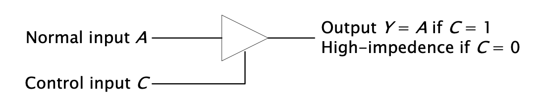 three-state-gate란 말그대로 3가지 상태를 가지는 디지털 회로를 말합니다. 이 회로는 0, 1, high-impednece 라는 세 종류의 상태를 가집니다.