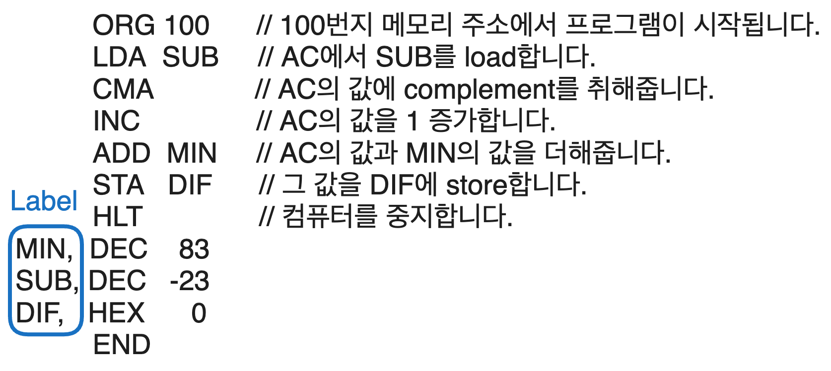자, 그럼 이제 이러한 어셈블리 언어로 작성된 프로그램을 배워봅시다. 아래는 두 수 83과 -23을 빼는 프로그램을 작성한 것입니다.