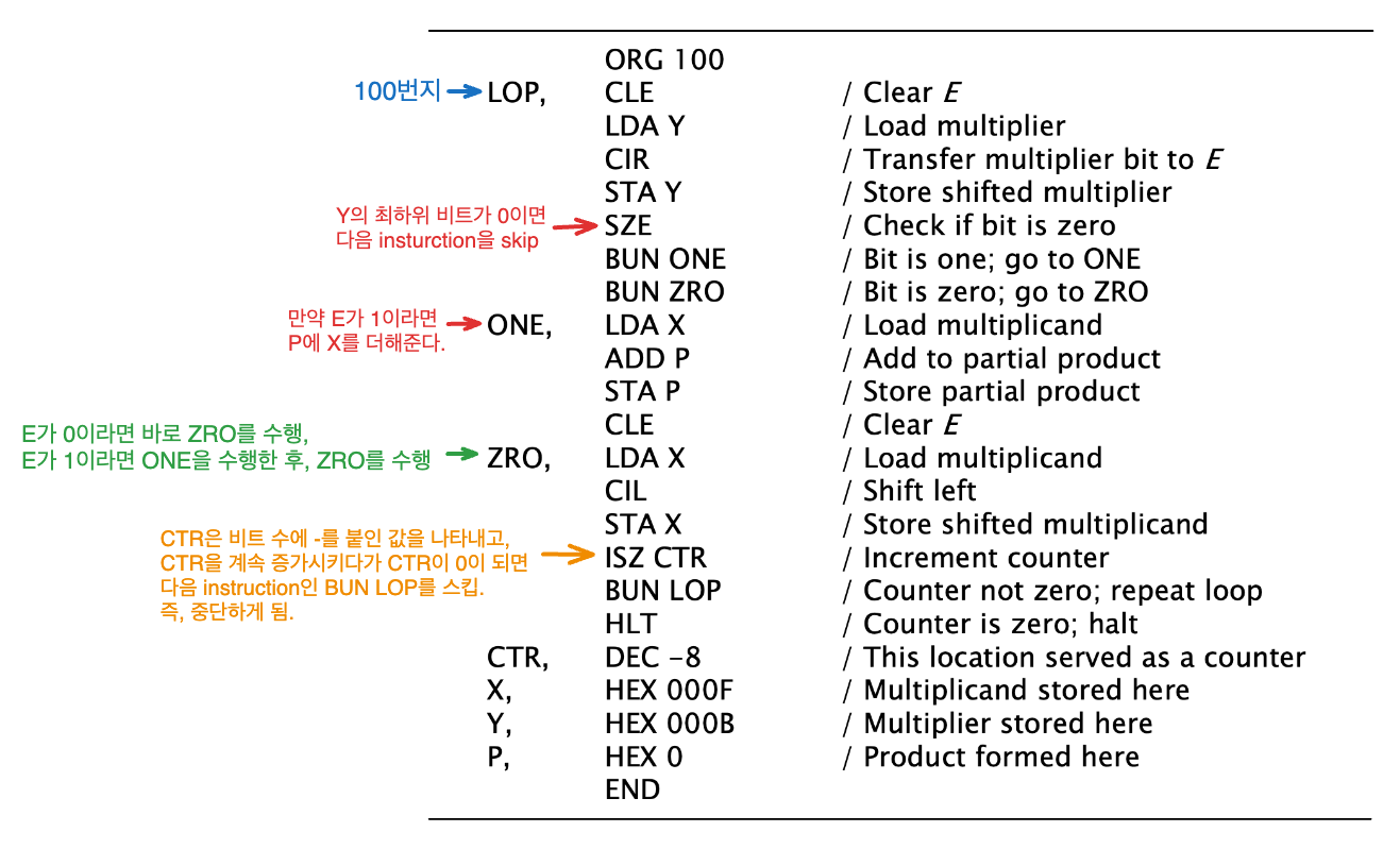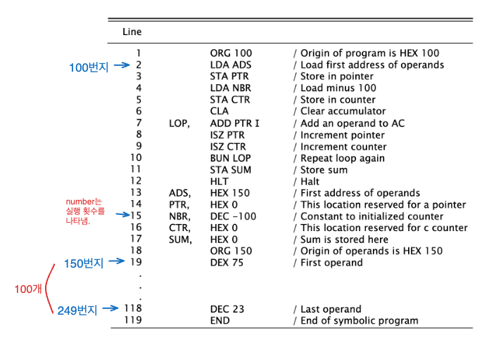 실행 순서는 그대로 따라가보면 어렵지 않습니다. 100번지부터 시작하며, ADS를 PTR에 대입합니다. ADS는 메모리에 연속해서 위치해있는 배열의 첫번째 주소 값을 나타내고, PTR은 배열에서 가져올 메모리 주소를 의미합니다. 150부터 249까지 차례로 증가할 것입니다. NBR은 총 loop를 몇번 돌아야하는지를 나타내고, CTR은 그 중, 몇 번 돌았는지를 확인합니다. 따라서 CTR은 -100부터 0까지 진행될 것입니다. 만약 0을 만났다면 BUN LOP 즉, loop의 시작으로 다시 돌아가서 진행하는 과정을 skip하게 되고 sum에 해당 값을 저장합니다.