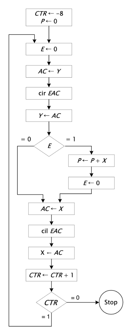 그럼 우리는 Y의 최하위 비트를 얻기 위해 shift 연산을 이용합니다. shift 연산을 이용하면 최하위 비트가 E 레지스터에 들어오게 되고 이 레지스터를 통해서 곱셈의 연산을 진행할 수 있습니다. 아래에는 그러한 곱셈 연산의 플로우 차트를 보여줍니다.