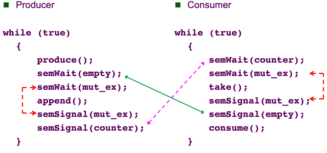 하지만 여기서는 producer와 consumer가 상호작용합니다. 목적이 다른 프로세스이지만, 같은 데이터 영역을 접근하므로 critical section에서 충돌할 수 있습니다. 여기서 Consumer는 Produce한 것이 존재하지 않으면 작동할 수 없기 때문에 가장 먼저 counter가 0보다 큰지 알아보기 위해 semWait(counter)를 진행합니다. 이를 지나갔으면, critical section을 수행하는지 확인하기 위해 semWait(mut_ex)를 수행하고, take()한 후 주어진 코드처럼 흘러갑니다.