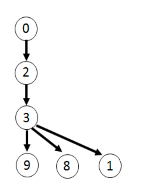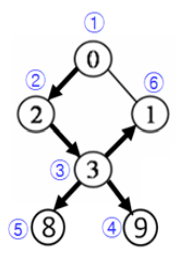 프로그램의 수행 결과는 0 -> 2 -> 3-> 9 -> 8 -> 1 -> 4-> 5 -> 7 -> 6이 되겠습니다.