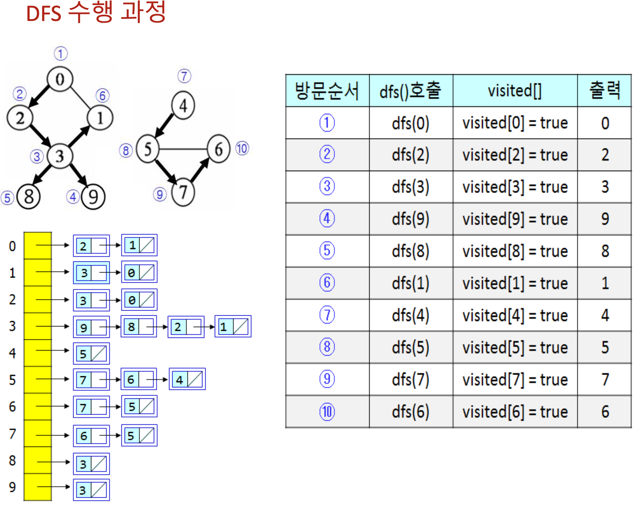 재귀를 이용하여 DFS를 구현합니다. 인접리스트가 꼭 하나의 연결성분으로 구성되어있음을 보장할 수 없으로 생성자에서 for문을 통해 모든 노드를 탐색합니다.