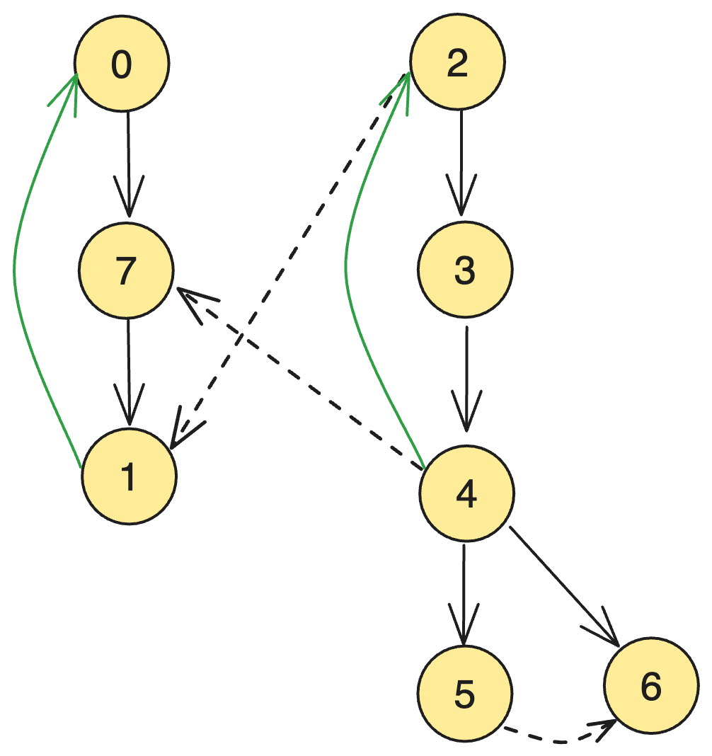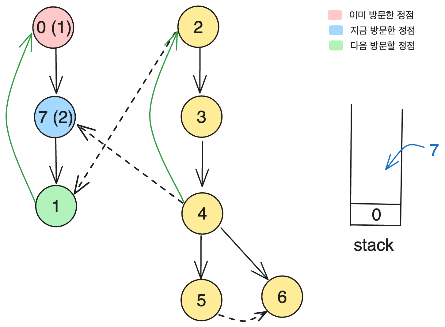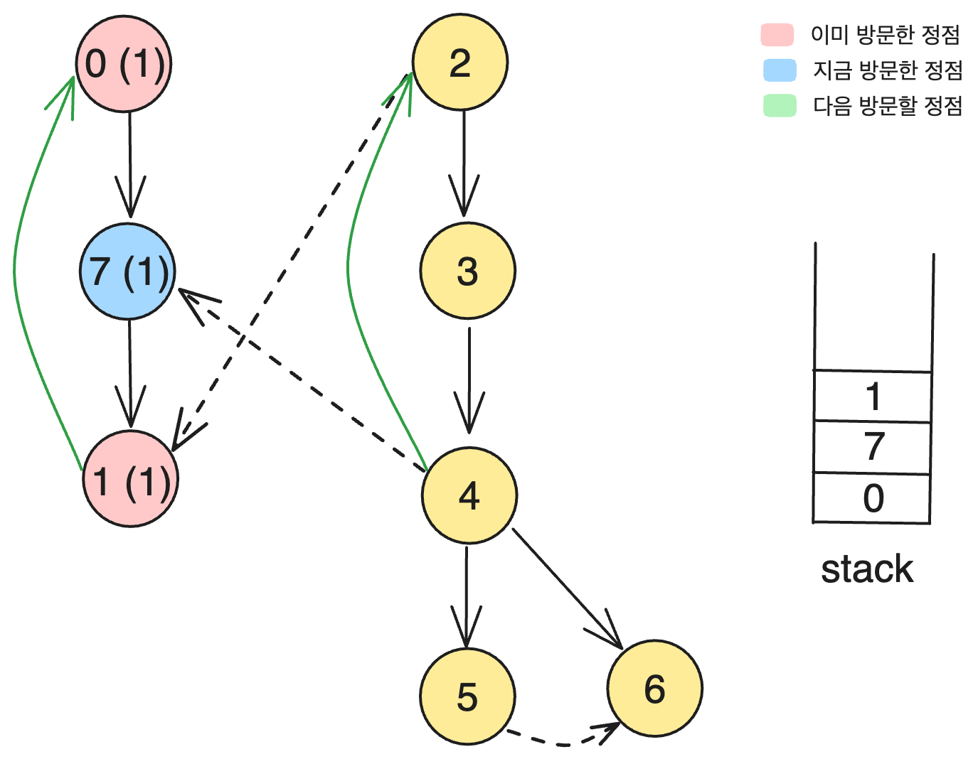 이제 7번 정점 또한 DFS를 종료하고 0번 정점으로 갑니다. 0번 정점은 7번 정점을 보고 깨닫습니다.