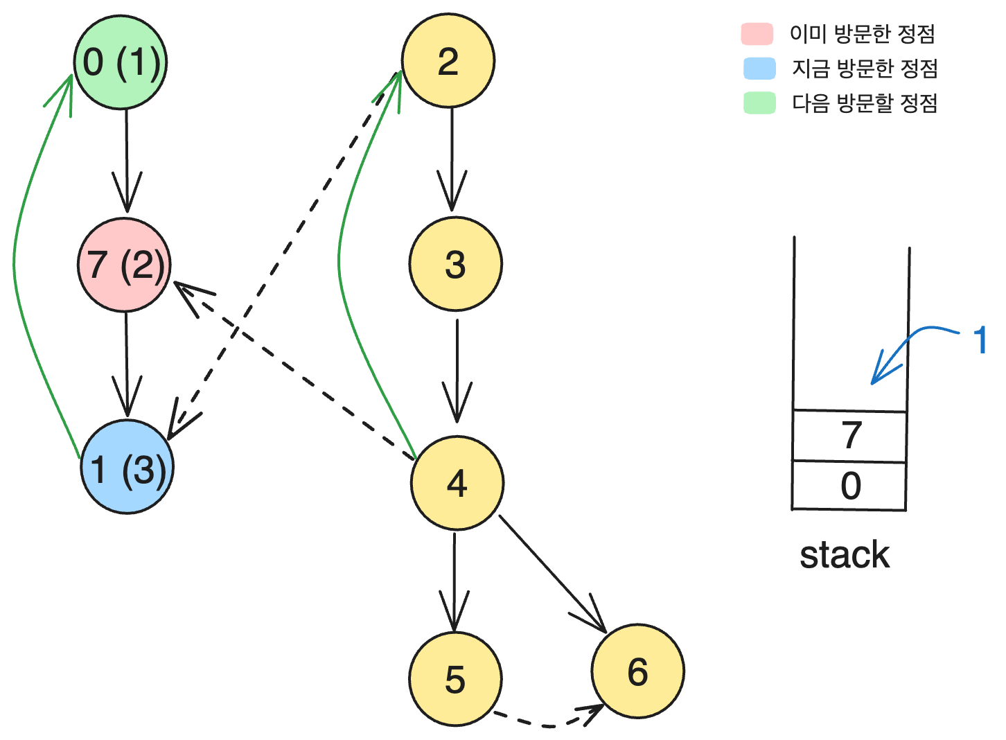 이제 7 차례입니다. 7 또한 stack에 넣고 다음 정점인 1을 방문하게 됩니다.