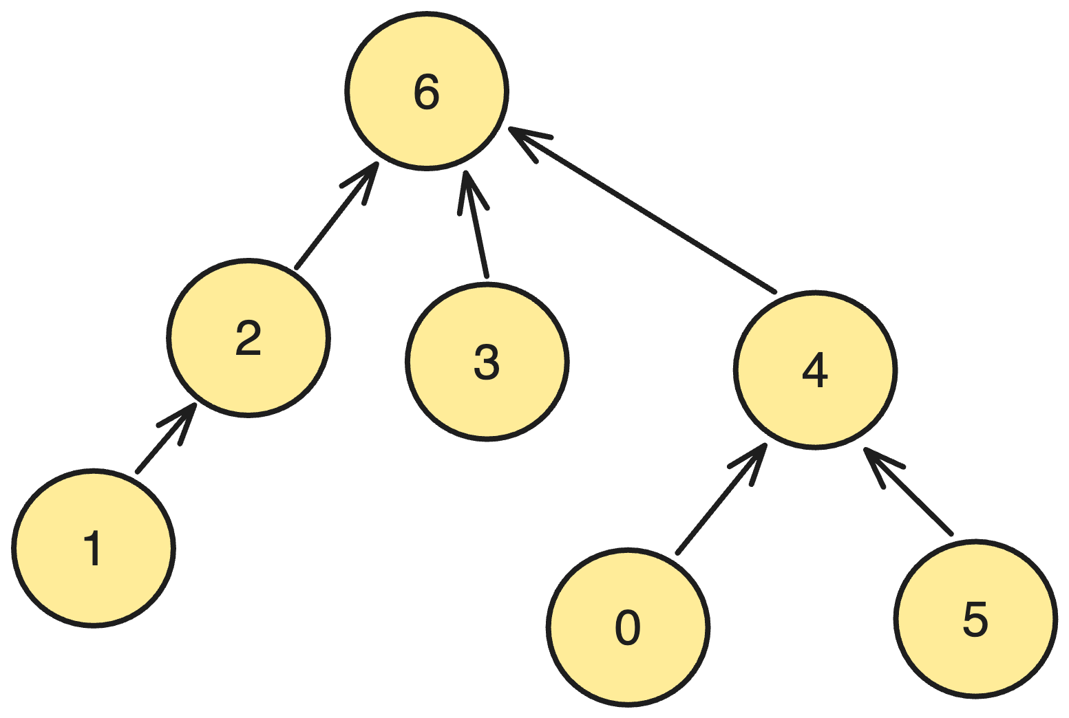 루트가 6인 트리는 rank가 3이고, 루트가 4인 트리는 rank가 2입니다. 따라서 우리는 루트 6의 트리 아래에 루트 4 트리를 합치기로 합니다.