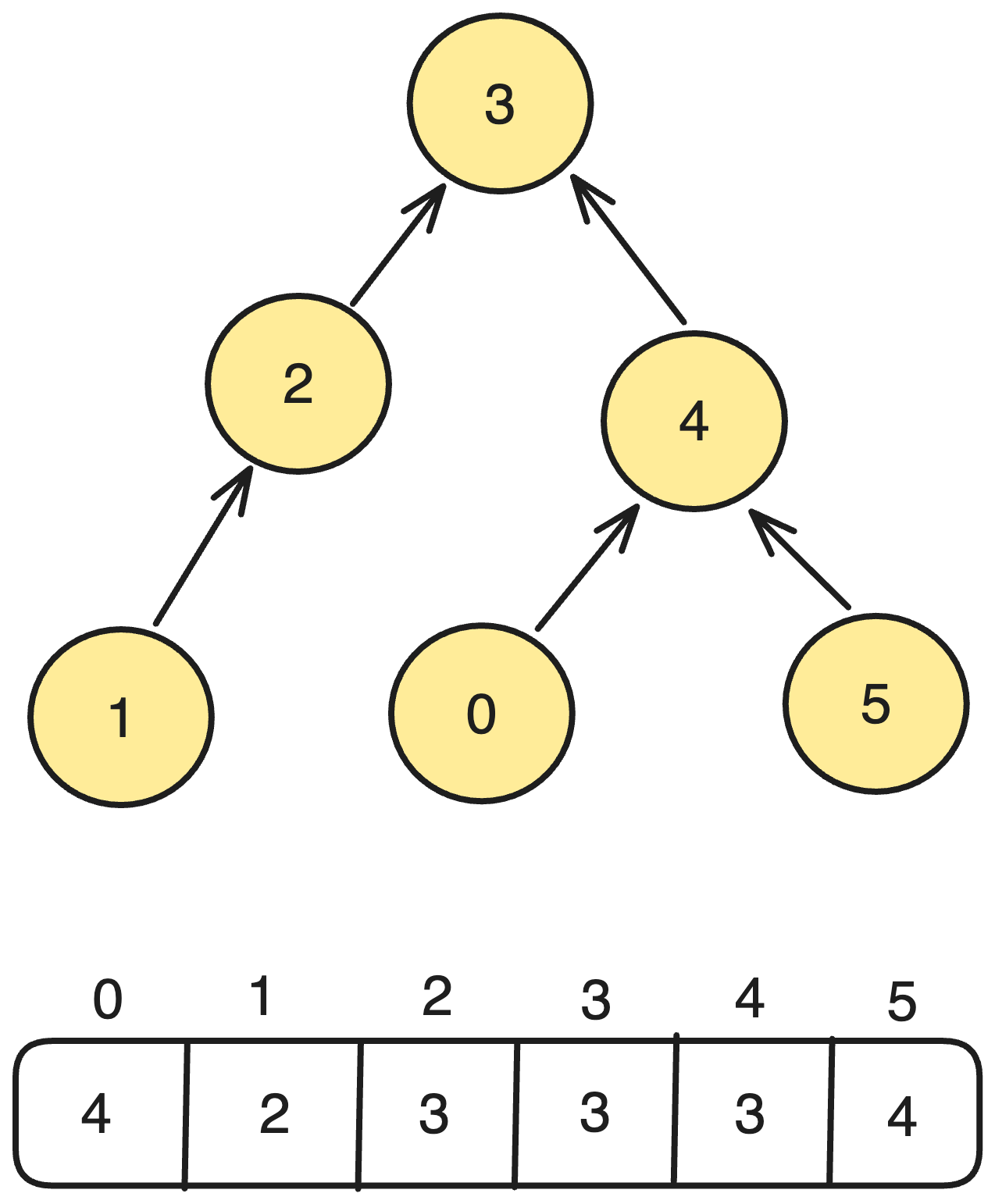 3. 배열에서 3의 위치에 해당하는 값을 확인합니다. 똑같이 3이겠네요. 그럼 여기서 3번 노드가 최상위 노드임을 인지합니다. 따라서, 5번 노드에 해당하는 최상위 노드는 3이 되겠죠.