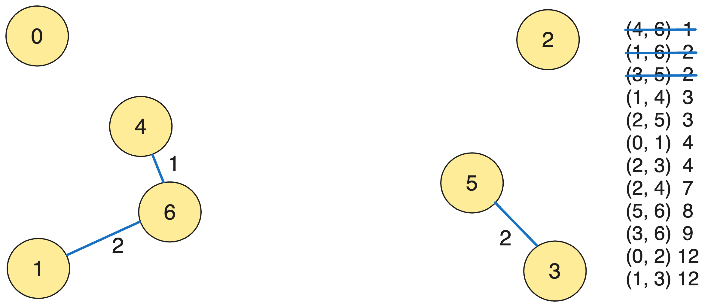 이제 (1, 6)을 이어줍시다. 싸이클이 생기지 않으니 괜찮습니다. (3, 5)까지 한번에 진행해줍시다.
