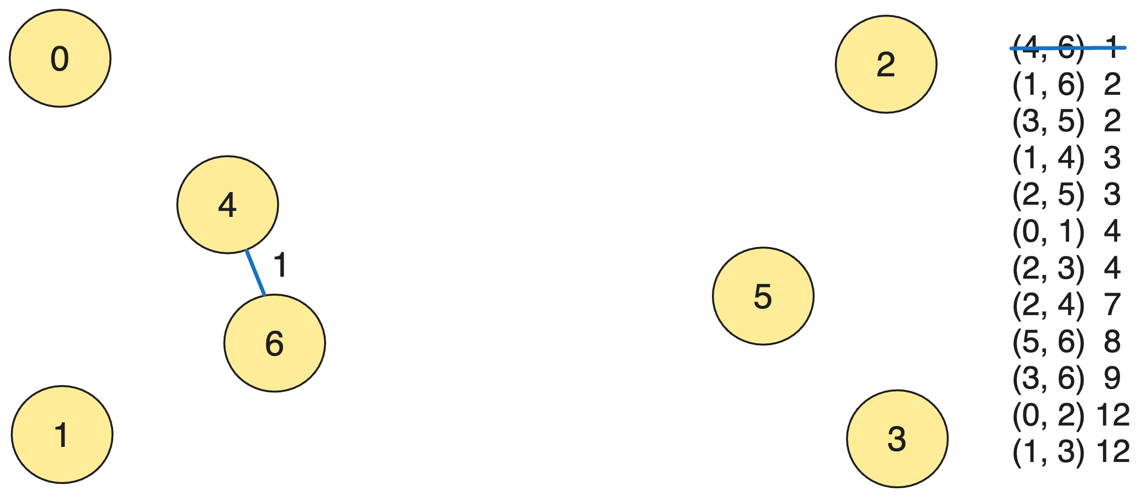 (4, 6)이 가장 먼저 선택되고 첫 간선이므로 바로 채택되겠네요.