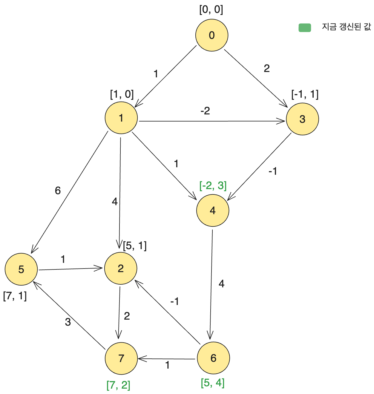 이제 우리는 정점 0으로부터 모든 정점까지의 최단 경롤를 구한 셈입니다. 물론 가중치가 음수인데도 말이죠.