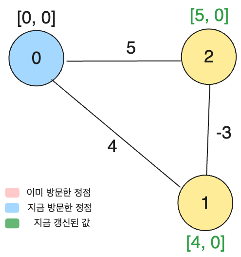 0번 정점을 우선 방문했습니다. 그리고 1번 정점과 2번 정점에 대해서 값을 갱신해줍니다.