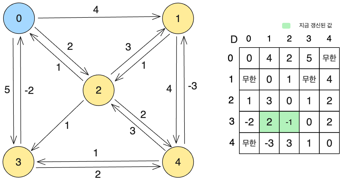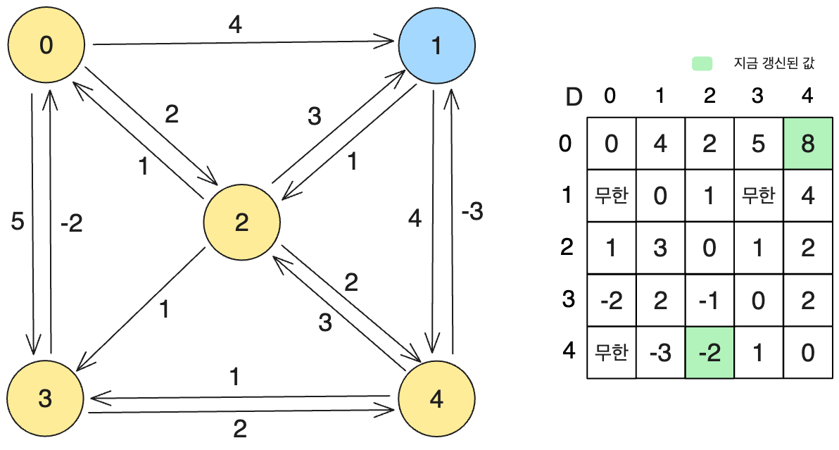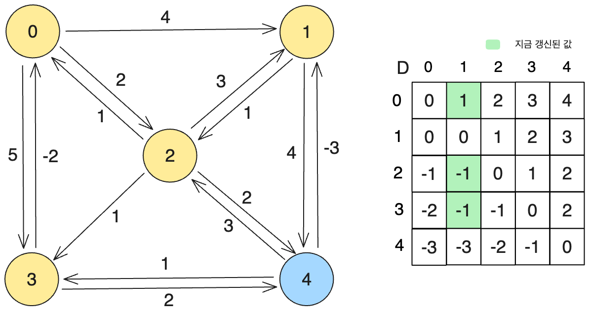이제 우리는 k=0, 1, ..., 4(=n-1)까지 반복하며 이중배열 D를 업데이트 해줄 것입니다.