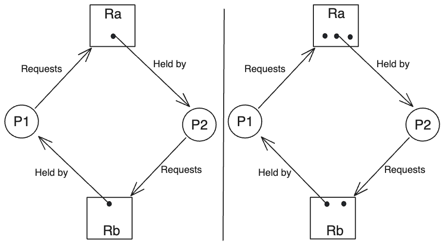 좌측처럼 Circular 하면서, 프로세스가 자원을 하나만 갖고 있다면 Deadlock이 발생합니다.