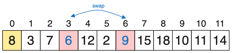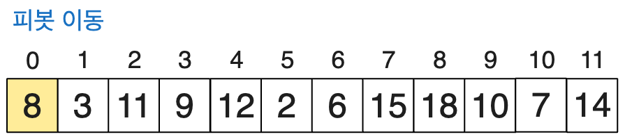 8을 기준으로 정렬을 시작하기에 앞서, 우선 피봇을 0번째 인덱스의 수와 바꿔줍니다.