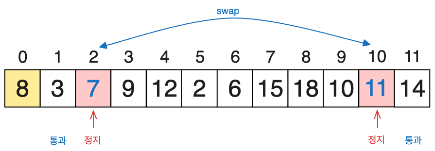 좌측에서 우측으로 이동하는 인덱스를 가리키는 변수를 i라고 하고, 우측에서 좌측으로 이동하는 인덱스를 가리키는 변수를 j라고 한다면, 정상적인 과정에서는 i < j 이겠지만, i >= j가 된다면 종료되게 되는 것이죠.