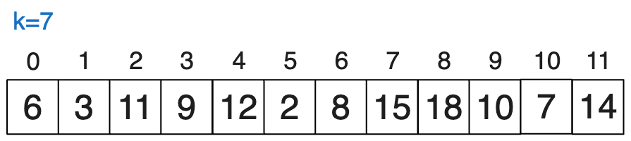 어?? 근데 조금 달라진 것이 있죠?? 원래 우리는 k=7이어서 7번째로 작은 수를 찾는 것이었는데, 우리가 오른쪽 수열만을 따로 가지고 와서 선택 알고리즘을 진행해야하므로 k는 당연히 달라져야합니다.