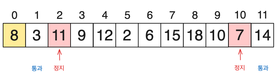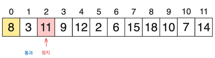 이제 11에서부터 왼쪽으로 이동해봅시다. 14는 통과하겠고 7은 8보다 작게 되니 조건에 맞지 않아 멈추게 될 것입니다. 아래와 같이 되겠네요.