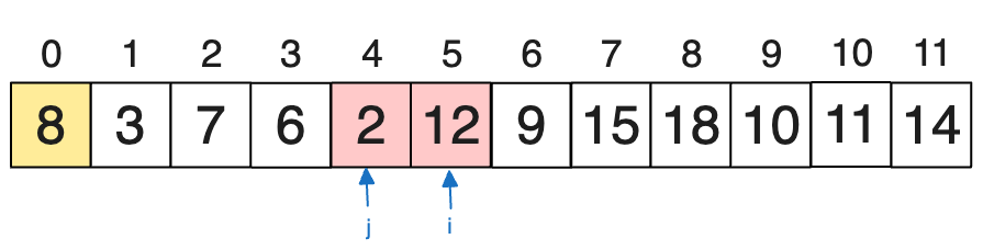 따라서 여기서는 인덱스 4, 5에 swap을 진행하고 i=5, j=4가 되므로 종료하게 됩니다. 그렇게 된 결과는 아래와 같습니다.