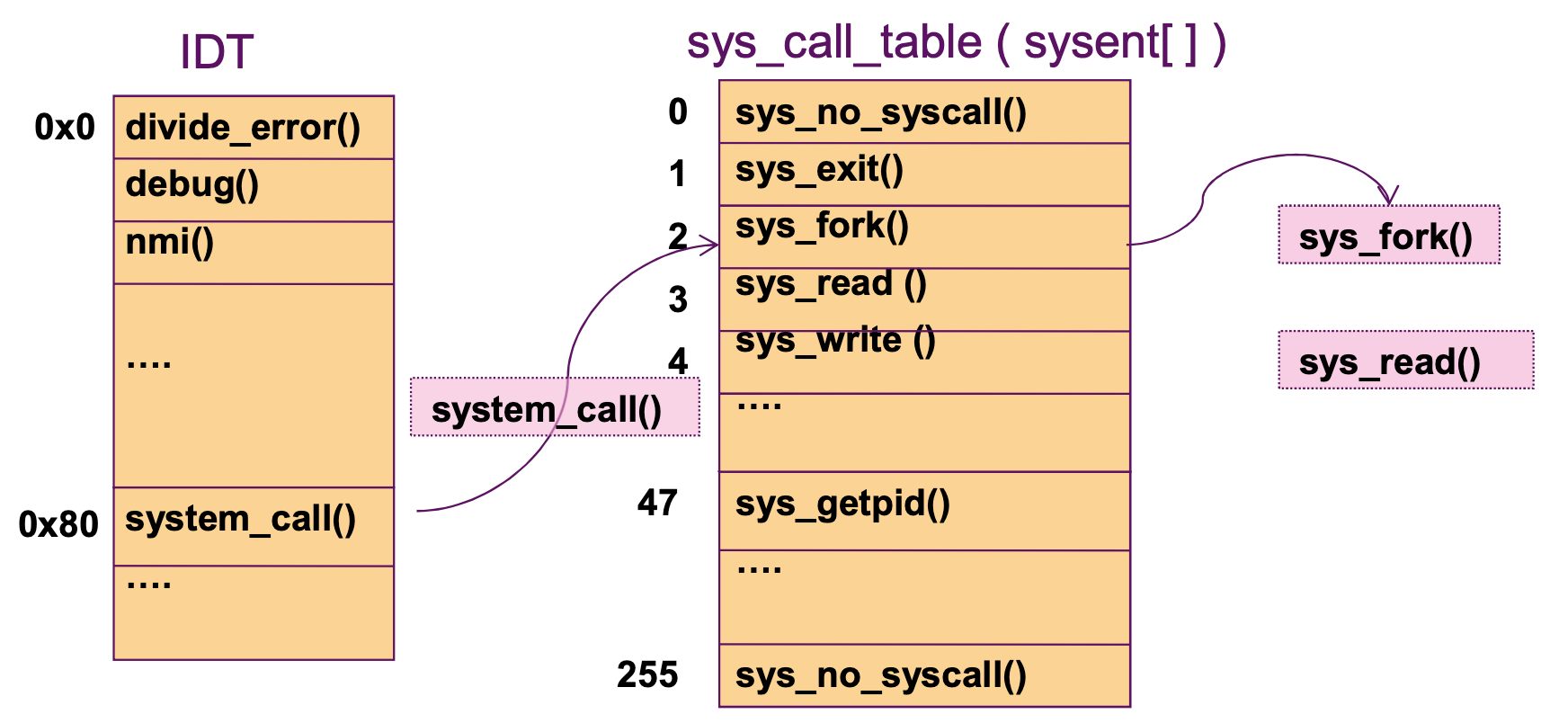 System call이 호출되었다면 IDT에 명시되어 있는 sys_call_table에서 해당하는 메서드의 주소를 따라가 실행하는 과정으로 동작됩니다.