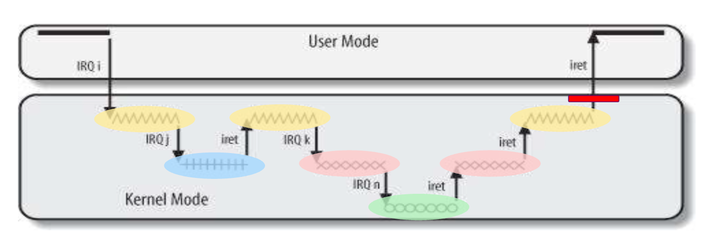 각 Interrupt를 같은 색으로 표현해보았습니다. 주목해야할 것은 가장 마지막에 빨간색 박스로 되어있는 부분입니다. 리눅스에서는 해당 부분을 return from ~ 으로 부르면서 특수한 동작을 수행합니다.