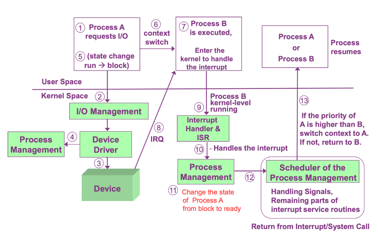 4. device driver는 device에게 임무를 할당한 후, process management를 통해서 run 상태인 자신의 프로세스를 block 상태로 변경을 요청합니다.