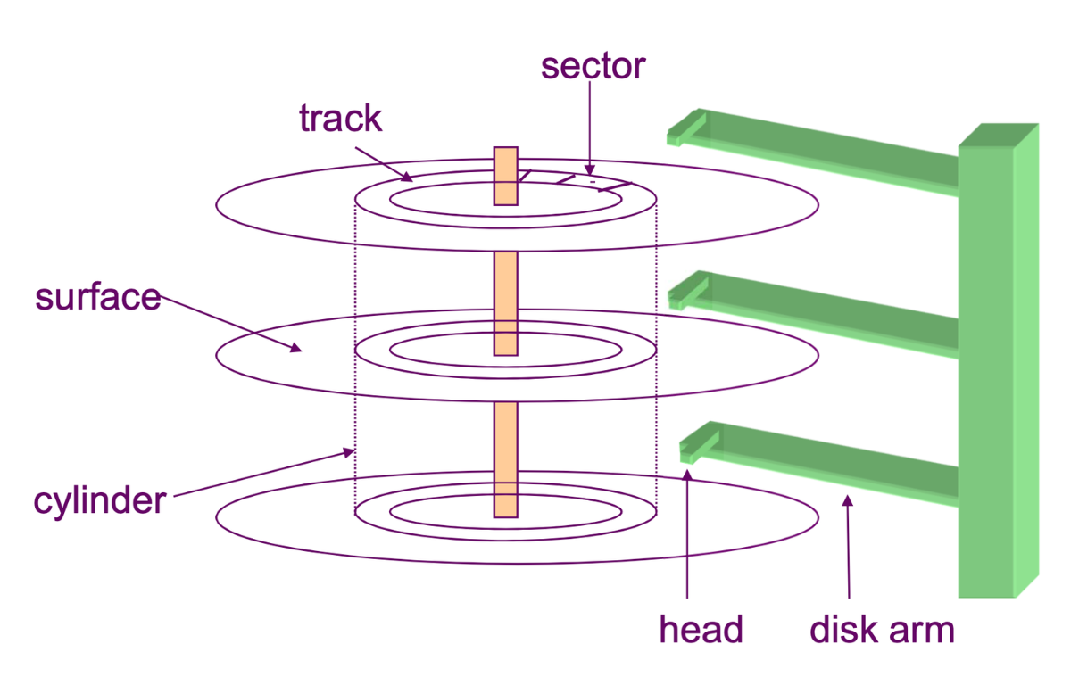 하나의 디스크당 양면에 데이터를 저장한다고 했으니, surface 즉, 데이터를 저장할 수 있는 표면은 2개입니다. 해당 그림의 surface는 총 6개가 되겠네요.
