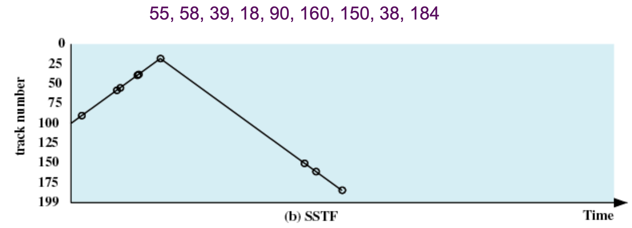 그래서 SSTF 방식이 도입되게 되었습니다. 현재 head가 위치해있는 track에서 가장 짧은 거리를 갖는 track의 데이터를 읽게되는 방식이죠.