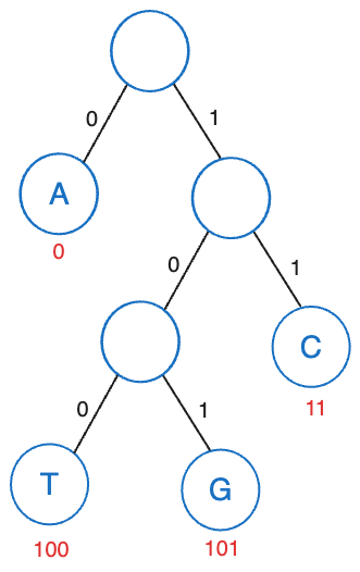 트리를 보면 리프노드에만 우리가 큐에 넣은 문자들이 있음을 알 수 있습니다. 따라서 우리는 리프노드로 갈 때까지 이진 코드를 한 비트씩 부여합니다.
