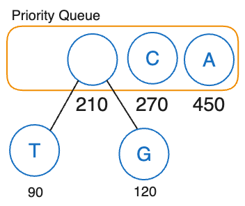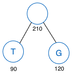 가장 먼저는 노드 2개를 pop합니다. 빈도수가 낮은 노드부터 나오게 되니 90인 T와 120인 G가 나오게 됩니다.