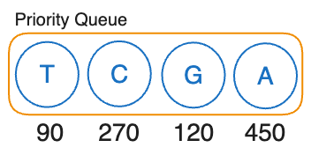 우리는 각 문자와 빈도수를 저장하는 노드를 만들고, 해당 노드를 담을 수 있는 우선순위 큐에 넣어줍니다. 우선순위 큐는 빈도수가 가장 낮은 노드를 우선적으로 내보냅니다.