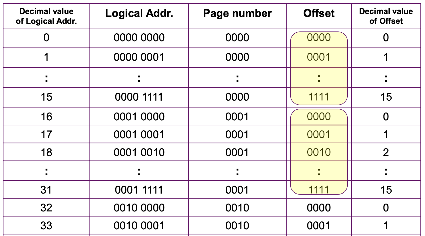 조금 더 쉬운 예시로 8비트 컴퓨터를 예시로 들어보죠. 페이지 사이즈는 16바이트라고 가정하면 offset이 총 4개가 필요합니다. 따라서 page number 4비트, offset 4비트로 구성되어 있을 것입니다.