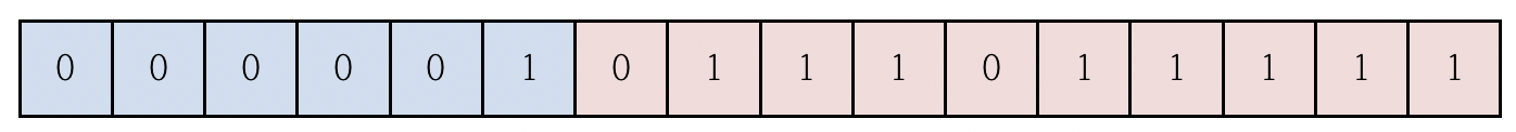 16비트 컴퓨터에 위와 같은 주소가 쓰여져있다고 가정해봅시다. 편의를 위해 page number를 가리키는 앞부분과 offset을 가리키는 부분은 구분해놓았습니다.