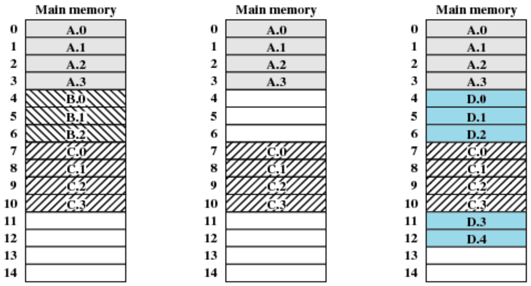 위는 페이징기법을 나타내줍니다. 세번째 그림에서 볼 수 있듯이, 기존에는 프로세스 D를 수용할 수 없지만 페이지 단위로 쪼개서 메모리에 저장하기에 다음과 같은 배치가 가능한 것입니다.