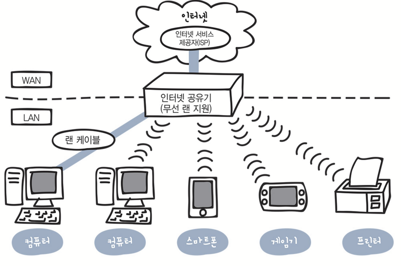 가정 내의 모든 기기들은 공유기에 무선으로나 유선으로나 LAN으로 연결되어 있습니다. 그리고 인터넷 공유기가 ISP와 연결됨으로써 네트워크가 구성됩니다.