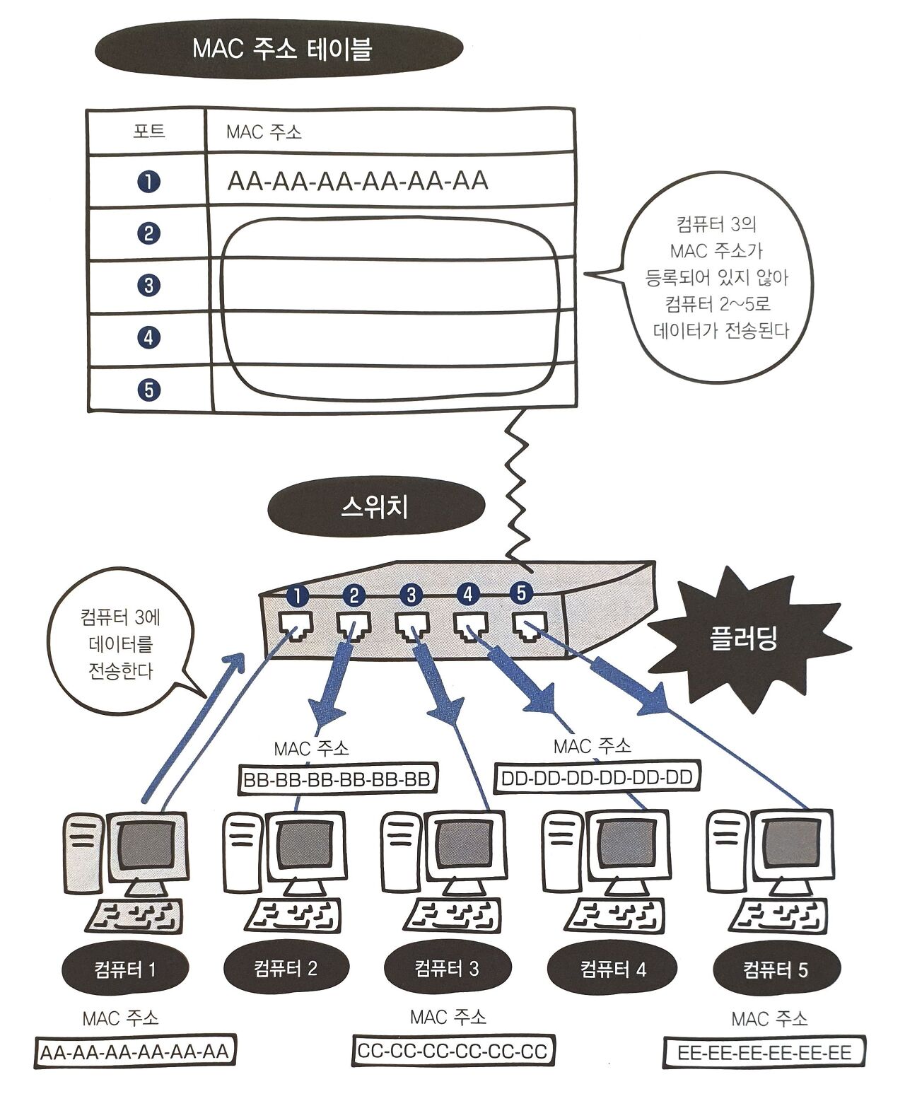 또한 프레임 내에 목적지 MAC 주소가 MAC 주소 테이블에 등록되어 있지 않다면 송신측 포트를 제외한 모든 포트에 데이터를 보냅니다. 이를 플러딩(Flooding, 홍수)라고 합니다.