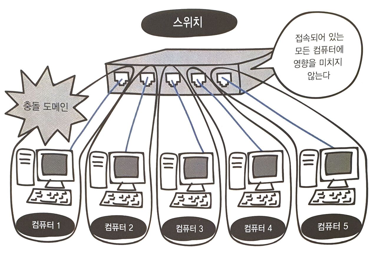 허브는 충돌이 발생하였을 때, 충돌 도메인이 허브에 연결된 모든 컴퓨터입니다. 하지만 스위치를 사용하게 된다면 충돌 도메인이 해당 컴퓨터만으로 제한되므로 매우 좁아지게 됩니다.