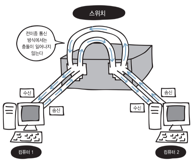 앞서 다룬 스위치는 전이중 통신 방식으로 구현되어 있으므로 데이터의 충돌이 일어나지 않습니다.