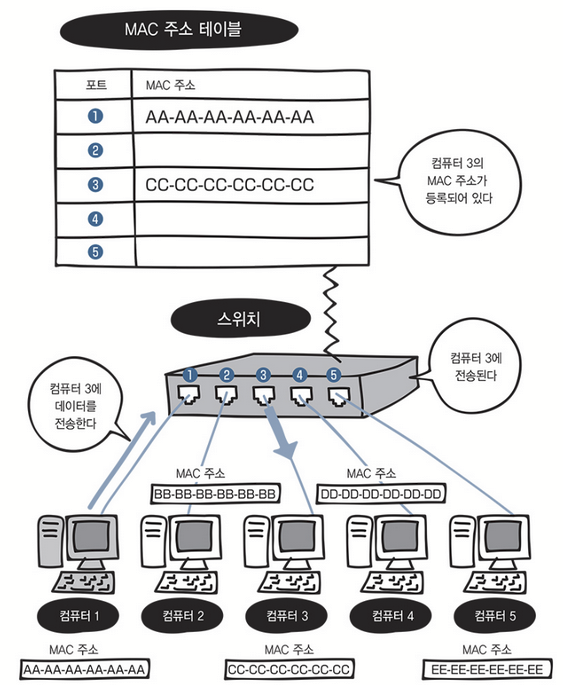 스위치 내부에는 MAC 주소 테이블이라는 데이터베이스가 존재합니다. 해당 데이터베이스는 스위치의 포트 번호와 해당 포트에 연결되어 있는 컴퓨터의 MAC 주소가 등록되어 있습니다.