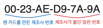 MAC 주소란 물리 주소라고도 불리며, 전 세계에서 고유한 번호입니다. MAC 주소는 총 48비트로 되어있으며, 앞 24비트는 랜 카드를 만든 제조사에게 부여된 번호, 뒤 24비트는 제조사가 붙인 랜 카드의 일련 번호입니다.