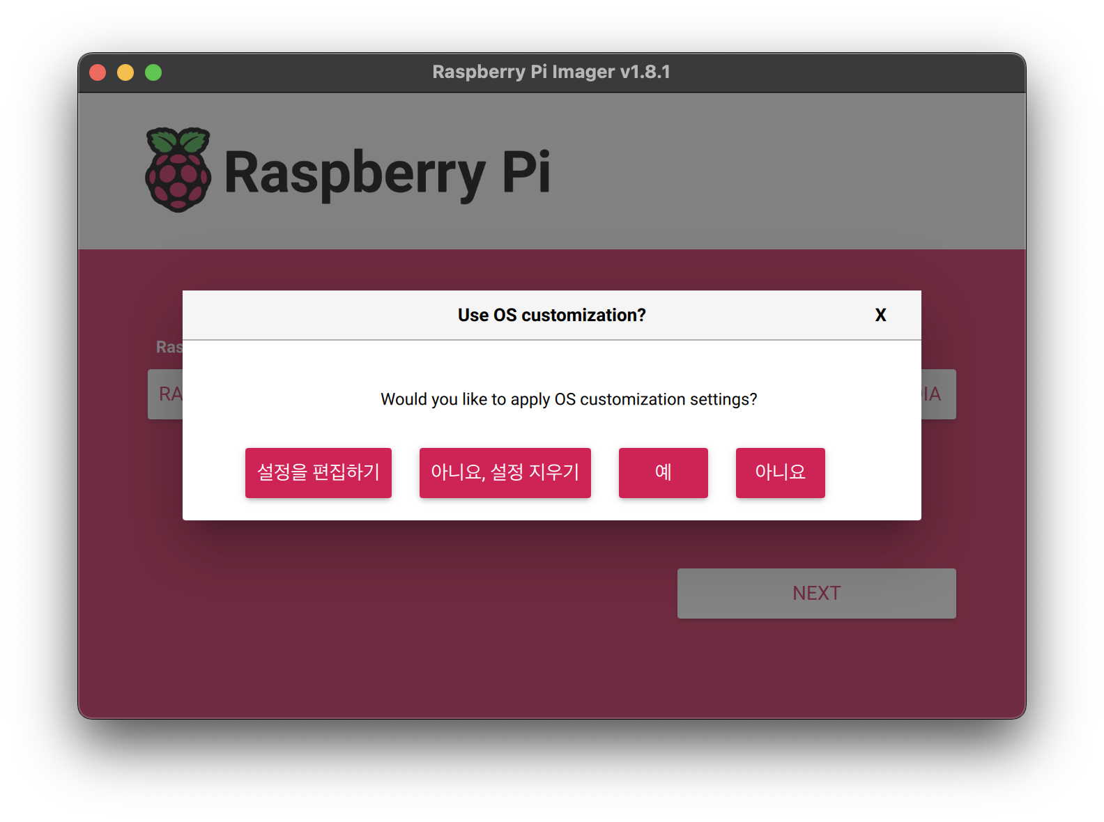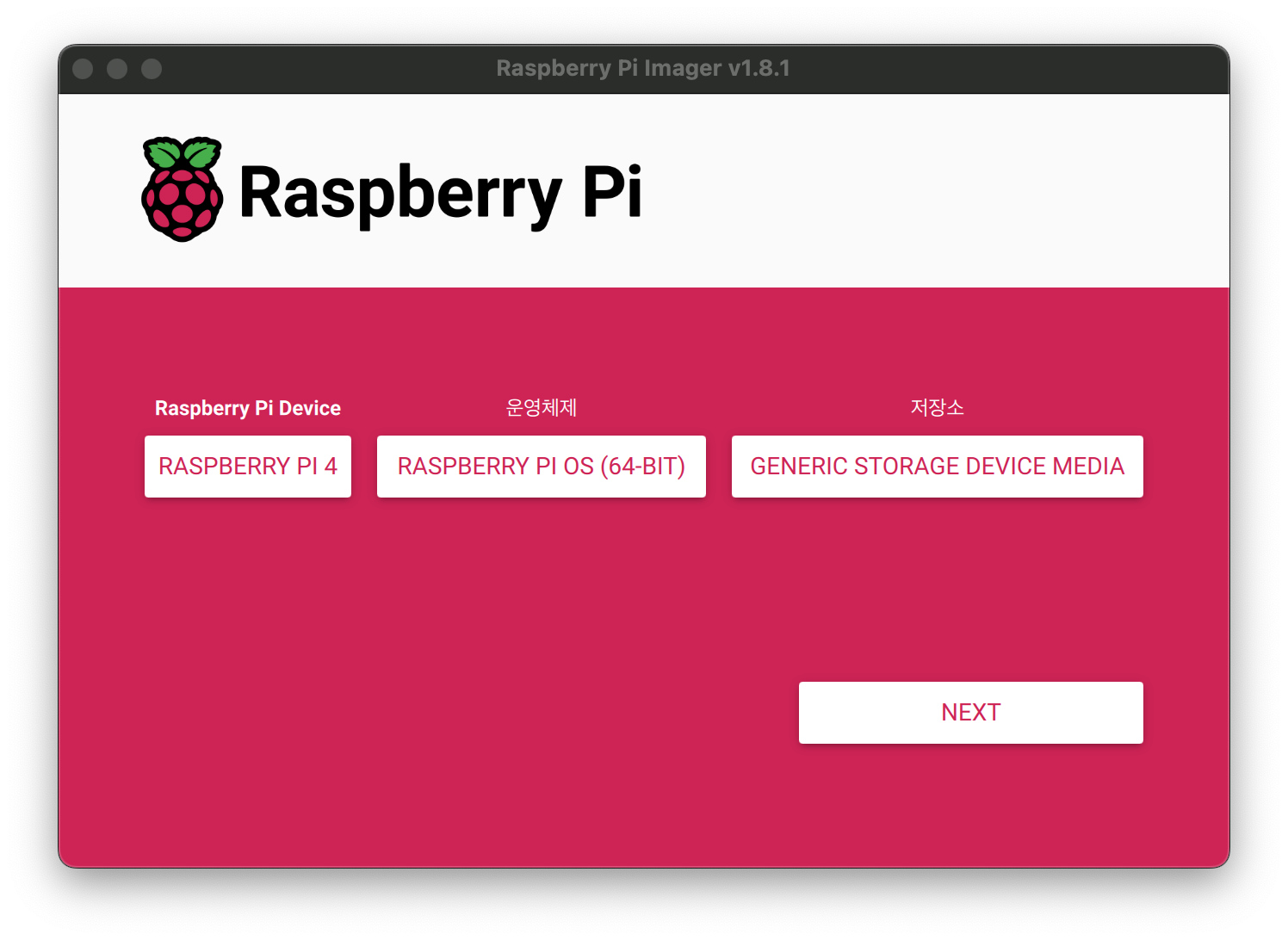 본인의 파이에 맞는 기기와 OS를 선택하여 주고, 저장소를 방금 연결한 파이의 SD 카드를 선택해준 후 NEXT를 눌러줍니다.