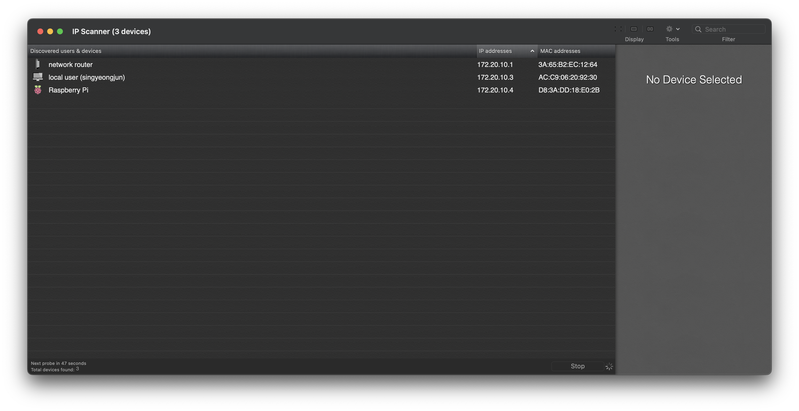 그 후, 자신의 노트북에서(맥북) 모바일 핫스팟에 연결한 후에, ip scanner를 통해서 내 노트북에서 연결한 무선랜에 접속한 접속자를 확인해줍시다. IP Scanner는 내 노트북에 연결된 와이파이에 연결된 다른 기기들의 정보를 확인할 수 있습니다.