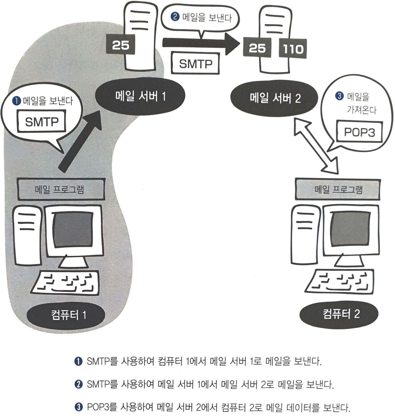 여기서 메일 서버 1은 컴퓨터 1이 사용하는 메일 프로그램의 서버이고, 메일 서버 2는 컴퓨터 2가 사용하는 메일 프로그램의 서버입니다.