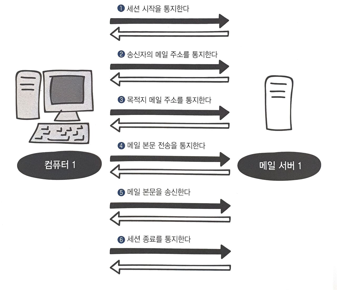 컴퓨터 1에서 메일 서버 1로 보내는 통신을 조금 더 자세하게 살펴봅시다. 아래와 같은 방식으로 메일의 송신이 이루어집니다.