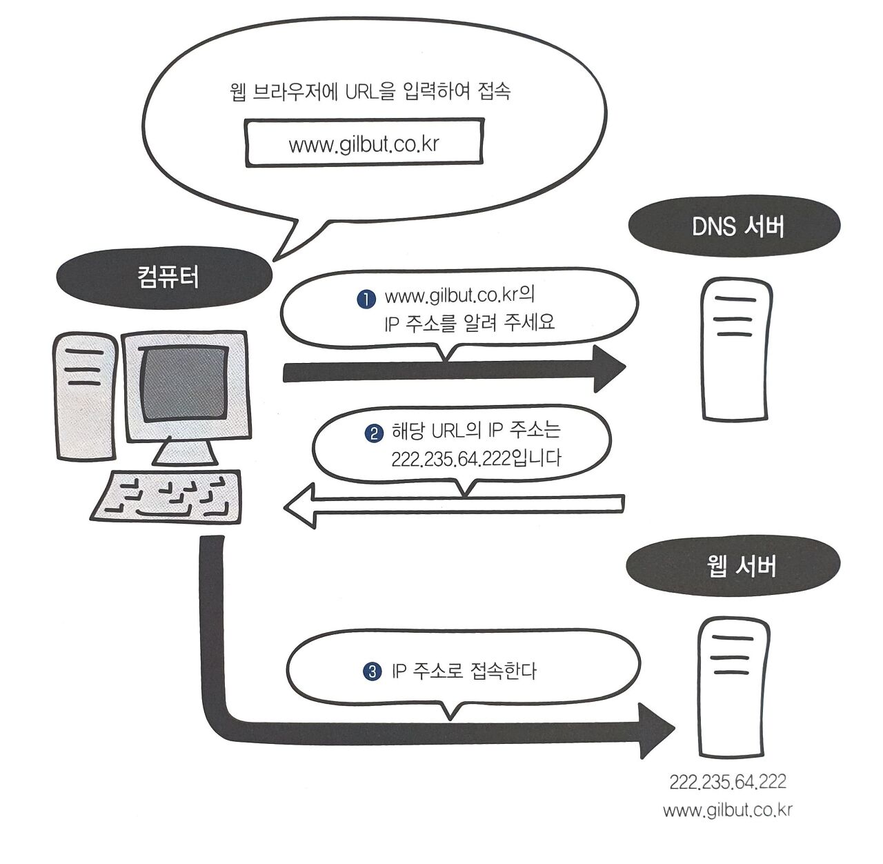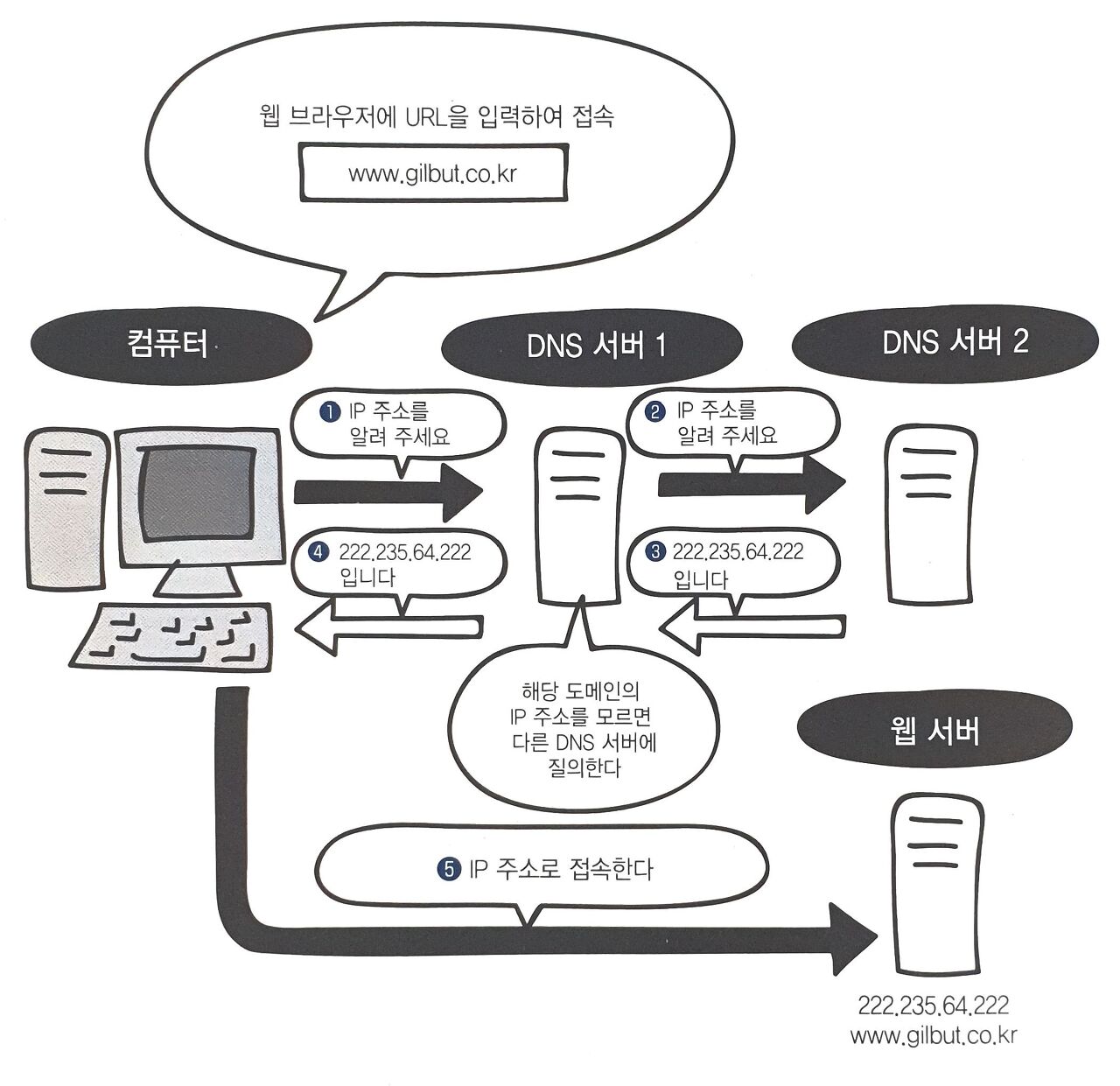 아래는 클라이언트가 특정 URL에 접속하려고 할 때, 실제 IP를 얻어 웹 사이트에 접속하는 모습을 보여줍니다.