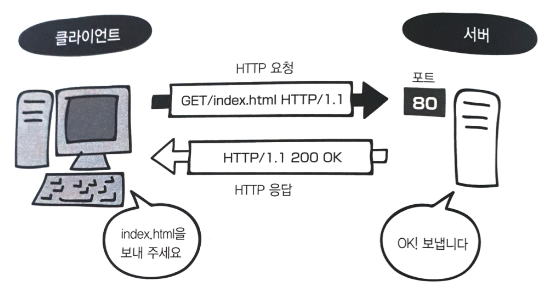 클라이언트가 웹 사이트를 보기 위해서는 서버의 80번 포트를 사용하여 HTTP 통신을 합니다. 클라이언트가 HTTP 요청을 서버에게 보내고, 서버는 해당 HTTP 응답을 반환하게 되는 것이죠.