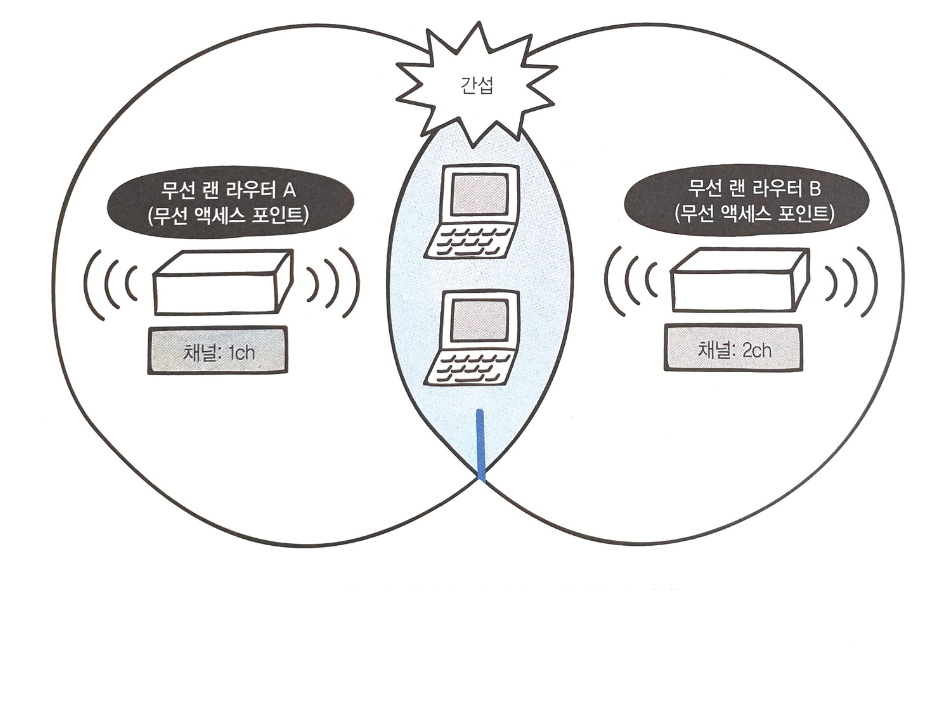 한 무선 공유기에 연결된 모든 기기들은 같은 주파수 대역을 사용합니다. 만약 여러 무선 공유기를 둘 때, 같은 주파수 대역을 사용하게 되면 전파 간섭이 일어나게 되므로 통신 속도 저하의 요인이 됩니다.