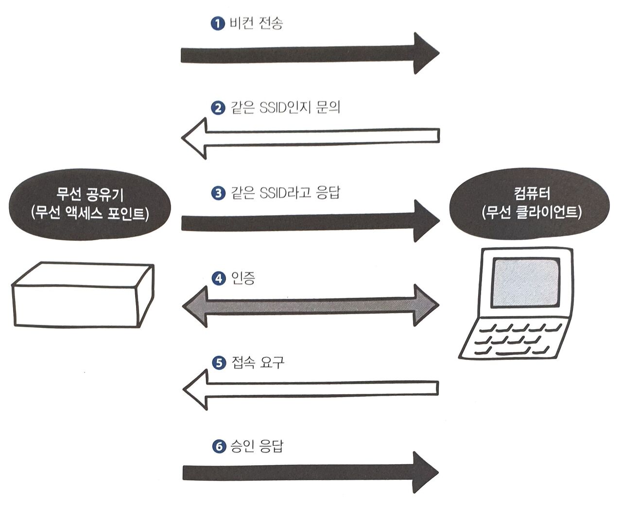 무선 클라이언트와 무선 액세스 포인트 간의 연결 과정은 아래와 같습니다.